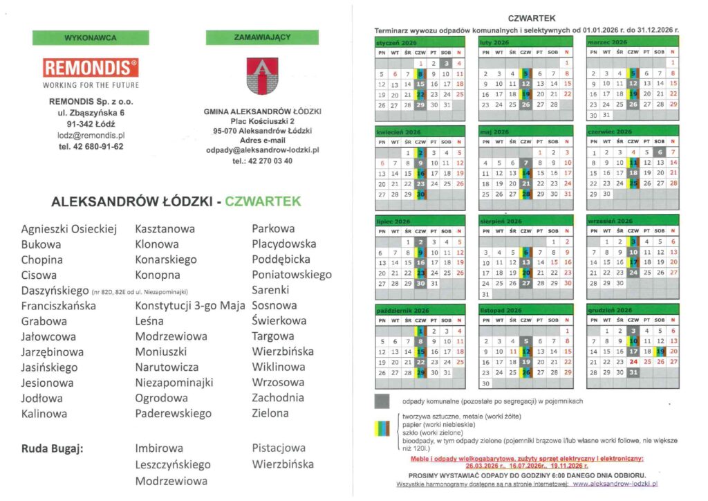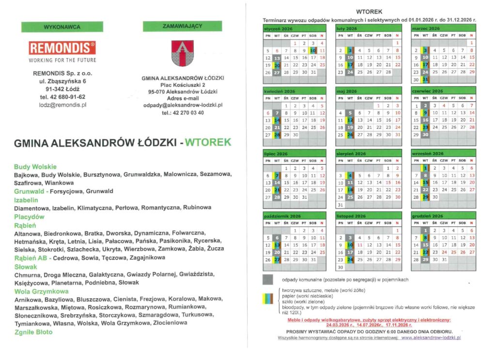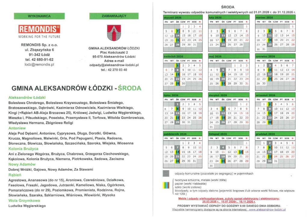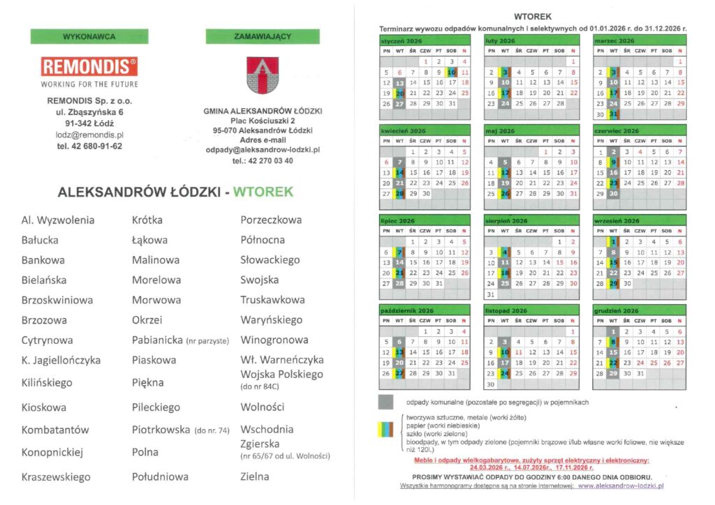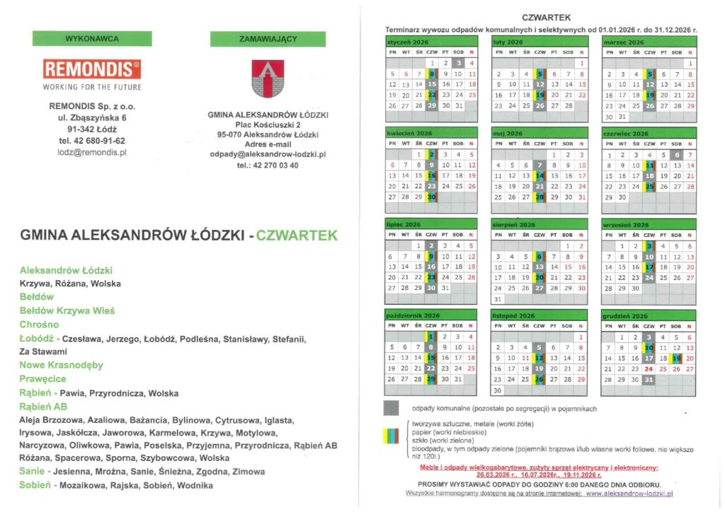 Nieruchomości zamieszkałe – harmonogram odbioru odpadów od 1 stycznia do 31 grudnia 2026