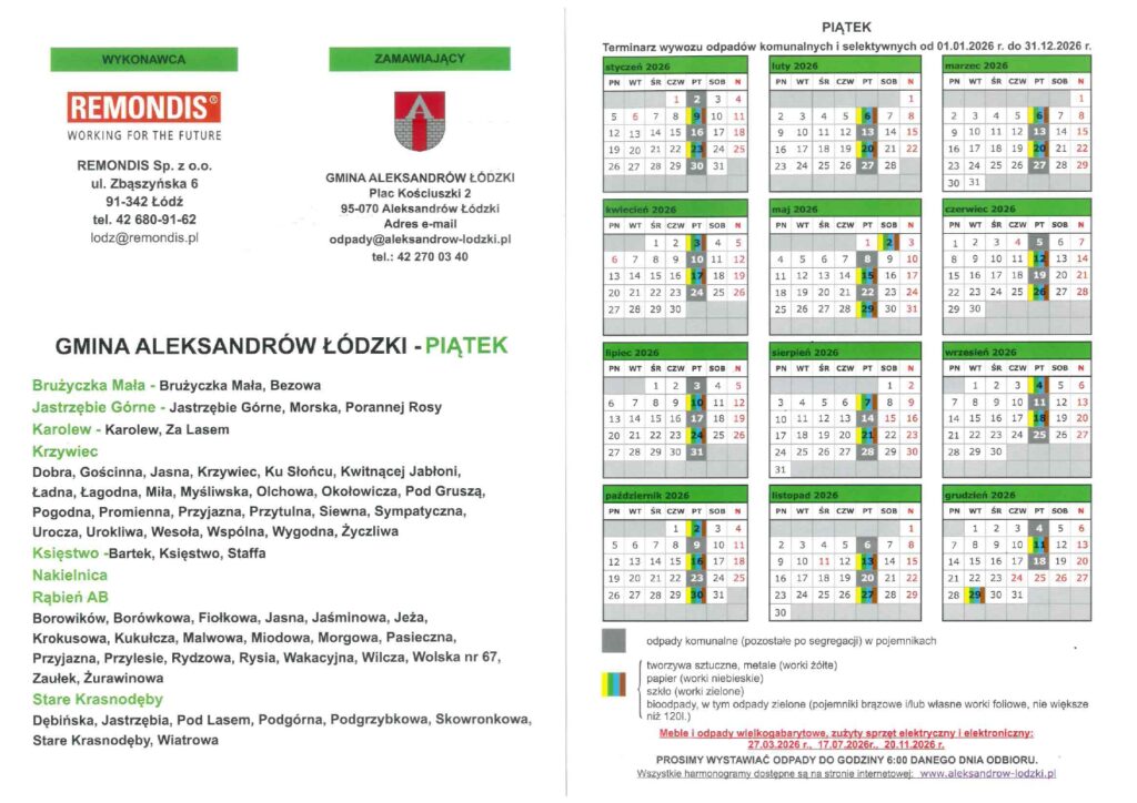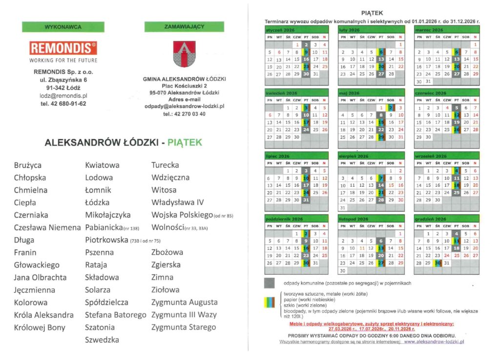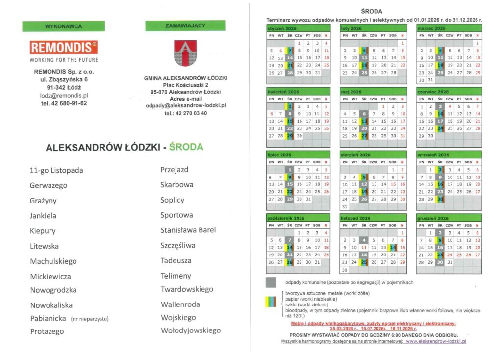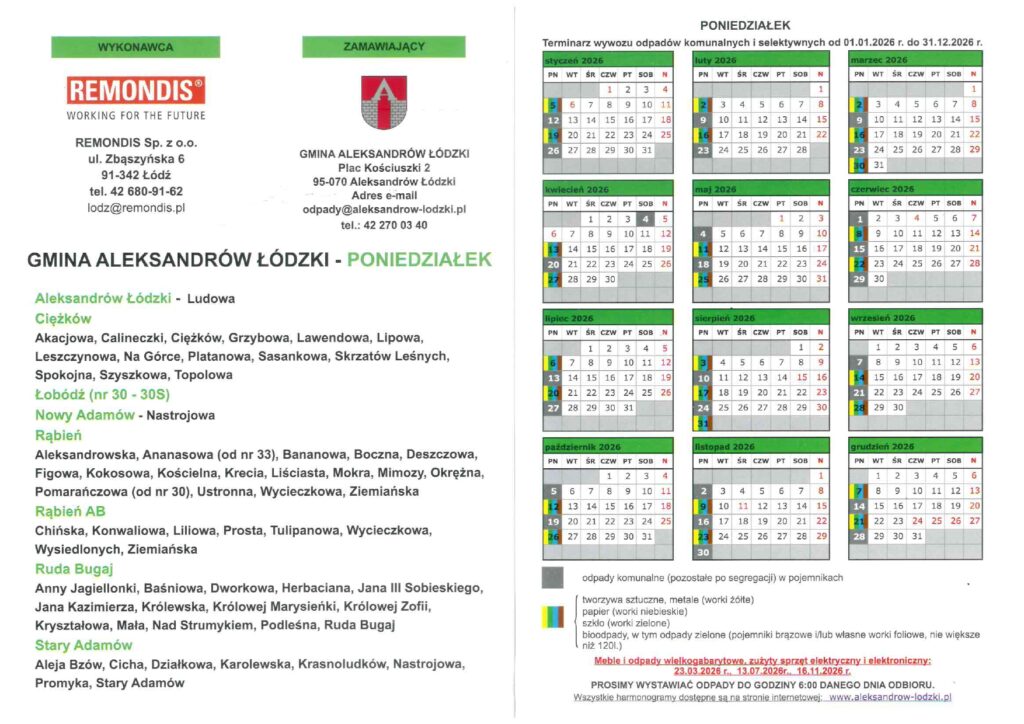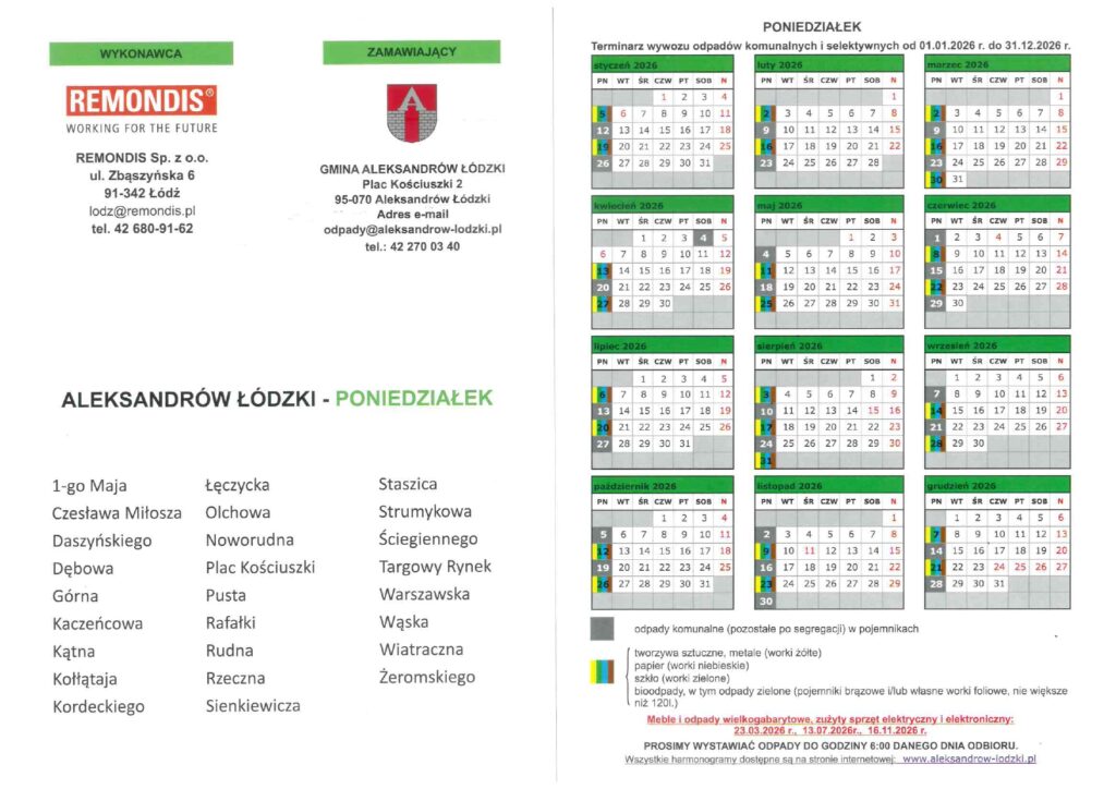 Nieruchomości zamieszkałe – harmonogram odbioru odpadów od 1 stycznia do 31 grudnia 2026