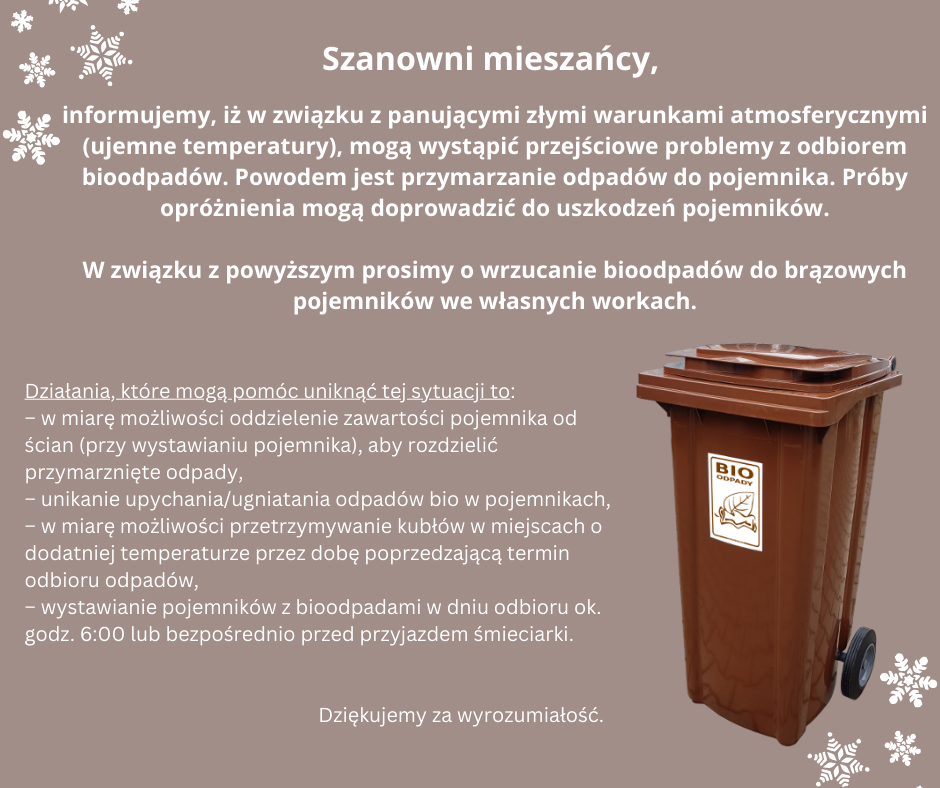 KOMUNIKAT – problemy z odbiorem bioodpadów z powodu przymarzania ich do pojemnika