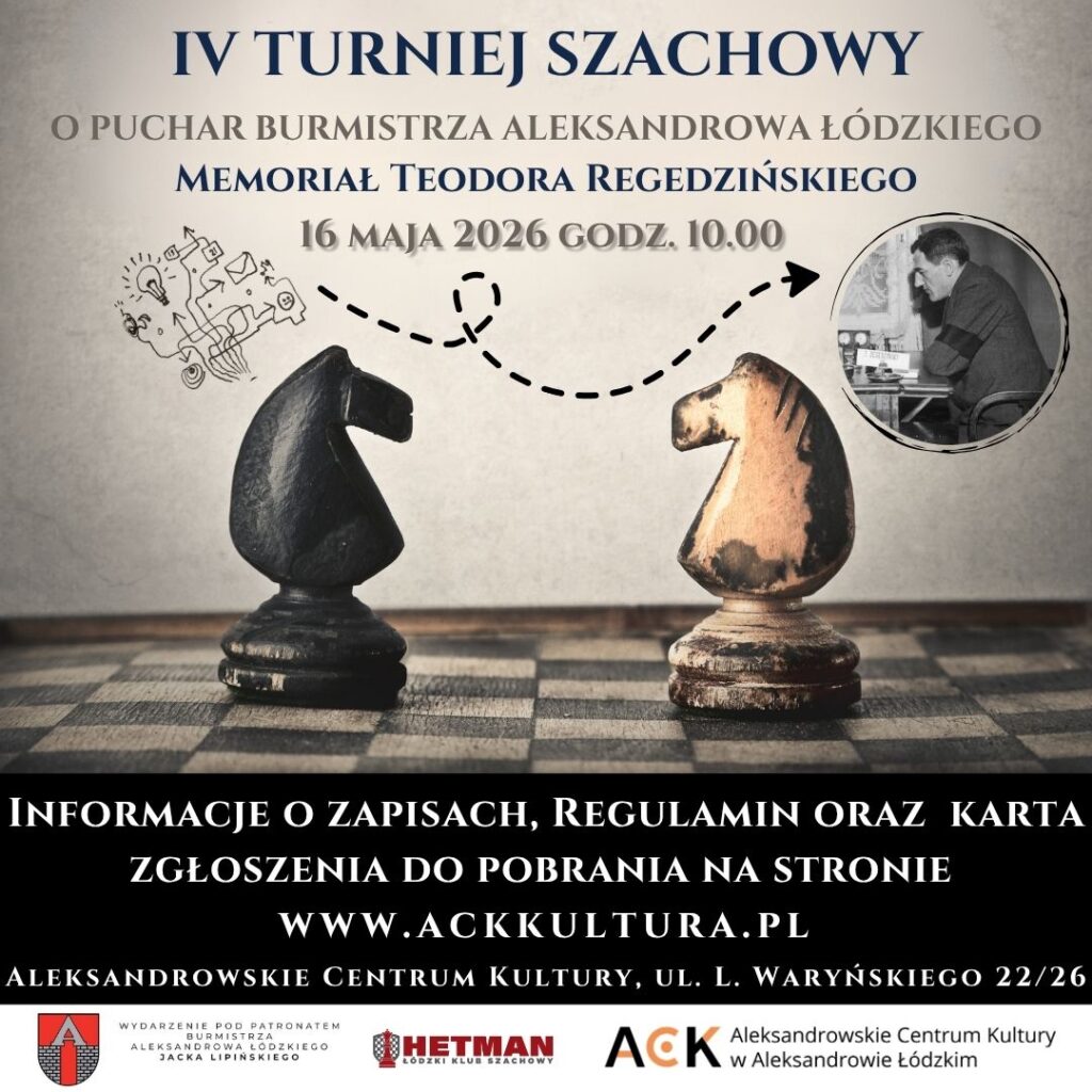 Zbliża się czwarta edycja Turnieju Szachowego o Puchar Burmistrza Aleksandrowa Łódzkiego – Memoriał Teodora Regedzińskiego. Zapisy na zawody mają charakter otwarty: wziąć w nich udział mogą wszyscy chętni, choć liczba miejsc jest ograniczona a o zakwalifikowaniu decyduje kolejność zgłoszeń.