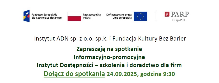 Instytut ADN sp. z o.o. sp. k. oraz Fundacja Kultury bez Barier zapraszają Przedsiębiorców do udziału w projekcie Instytut Dostępności – szkolenia i doradztwo dla firm, o numerze FERS.01.03-IP.09-002/24.