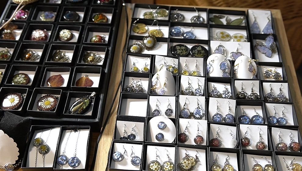 – To są głównie roślinki z mojego ogródka, wyhodowane przeze mnie, które potem zalewam w żywicy. Czasem jestem w lesie, zobaczę kwiatka i już wiem, że będzie idealny do naszyjnika – opowiada.