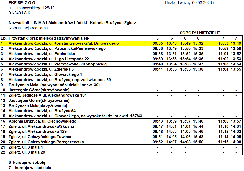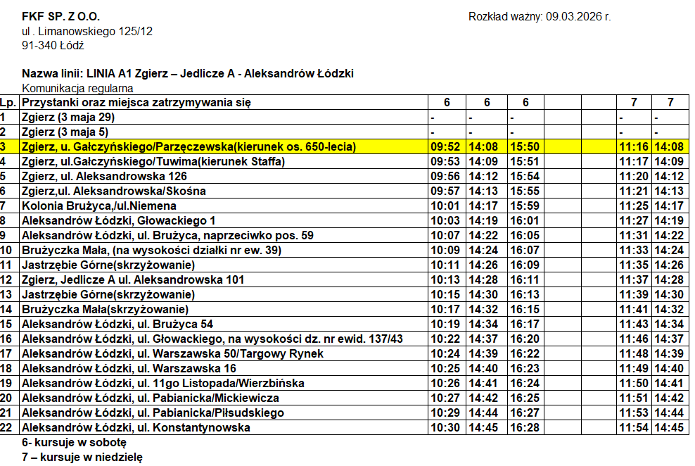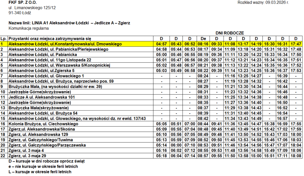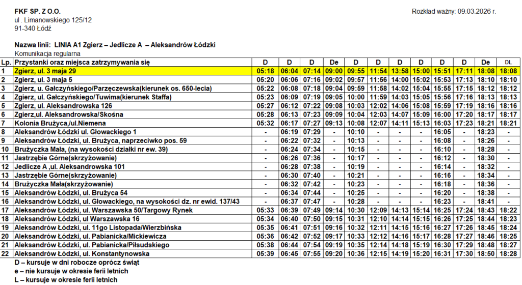 Informujemy, iż od 30 marca 2026 r. zmianie ulegnie rozkład jazdy linii A1 , która kursuje na trasie Aleksandrów Łódzki -Jedlicze A- Zgierz.
