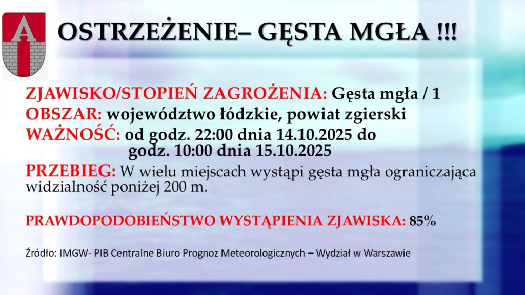 Ostrzeżenie meteorologiczne nr 82 dotyczące wystąpienia gęstej mgły w powiecie zgierskim od godz. 22:00 dnia 14.10.2025 do godz. 10:00 dnia 15.10.2025. Widzialność będzie wynosić poniżej 200m. Prawdopodobieństwo wystąpienia 85%.