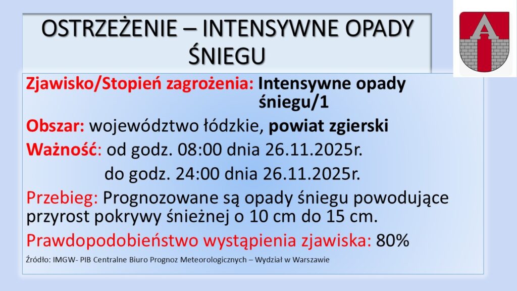Ostrzeżenie – intensywne opady śniegu Dodano: 25.11.2025 Autor: Krzysztof Stefanek ZOBACZ TEŻ: 24.11.2025 Uwaga-opady marznące! 20.11.2025 Bieg z Mikołajem 20.11.2025 Komunikat 20.11.2025 Porozmawiajmy o męskich sprawach – bez tabu i z troską o zdrowie! Aktualności Aktualności 20.11.2025 Inspektorat ZUS w Zgierzu zaprasza na konsultacje emerytalne Aktualności 17.11.2025 UWAGA! Nie będzie wtorkowego dyżuru W najbliższy wtorek, 18 listopada, z powodu szkolenia nie będzie przyjęć Interesantów przez Burmistrza i Sekretarz Gminy. Zainteresowane osoby zapraszamy w kolejny wtorek – 25 […] AktualnościEkologia 07.11.2025 Spotkanie na temat bezpiecznego ogrzewania Departament Promocji Urzędu Marszałkowskiego Województwa Łódzkiego realizuje cykl trzech spotkań prelekcyjno-edukacyjnych dla mieszkańców województwa łódzkiego, poświęconych tematyce bezpiecznego ogrzewania budynków oraz ochrony jakości powietrza w okresie grzewczym. AktualnościEkologia 06.11.2025 INFORMACJA DLA WŁAŚCICIELI NIERUCHOMOŚCI ZAMIESZKAŁYCH Przypominamy o zastępczym wywozie odpadów komunalnych, segregowanych tj. tworzyw sztucznych, papieru, szkła oraz bioodpadów, z nieruchomości zamieszkałych, dla których odbiór odpadów przypada na wtorek 11 listopada 2025 r. – […] ZOBACZ WIĘCEJ