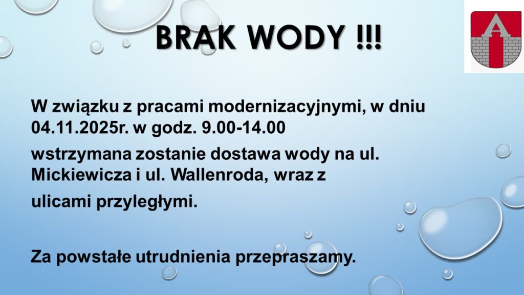 Uwaga! Brak wody! Dodano: 03.11.2025 Autor: Krzysztof Stefanek ZOBACZ TEŻ: 30.10.2025 Kongres Kobiet 30.10.2025 Uwaga – silny wiatr! 29.10.2025 Komunikat 28.10.2025 Święto Niepodległości – koncert pn. „Ojczyzno ma…” Aktualności Aktualności 23.10.2025 KOMUNIKAT ZDiT z dnia 23.10.2025 r. W związku ze zmianą czasu z letniego na zimowy (wskazówki zegarów zostanąprzesunięte z godz. 3:00 na godz. 2:00), Zarząd Dróg i Transportu informuje, iż w […] Aktualności 20.10.2025 UWAGA! Poszukiwani do współpracy: wystawcy, rękodzielnicy, producenci Ho, ho, ho! Za oknem piękna polska złota jesień, ale my już myślimy o… Aleksandrowskim Jarmarku Świątecznym. Jarmark odbędzie się 6 grudnia na placu Kościuszki, […] Aktualności 20.10.2025 KOMUNIKAT W związku z zaplanowanym koncertem zespołu Offspring w Atlas Arenie Zarząd Dróg i Transportu Informuje, iż w dniu 26.10.2025 r. (niedziela) w godz. ok. 18:30- 20:00 […] AktualnościMiasto i Gmina 17.10.2025 Informacja o polowaniach zbiorowych Gmina Aleksandrów Łódzki informuje, że zgodnie z obowiązującymi przepisami prawa koła łowieckie mają obowiązek przekazywania harmonogramów polowań zbiorowych, a gmina ma obowiązek ich ogłoszenia do […] ZOBACZ WIĘCEJ