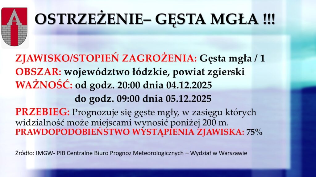 Uwaga-gęsta mgła! Dodano: 05.12.2025 Autor: Klaudia Kosak ZOBACZ TEŻ: 03.12.2025 Uwaga-gęsta mgła 02.12.2025 Uwaga-gęsta mgła 01.12.2025 Uwaga-gęsta mgła! 01.12.2025 KOMUNIKAT Aktualności Aktualności 28.11.2025 BRAK WODY Aktualności 27.11.2025 Uwaga-oblodzenie! Aktualności 27.11.2025 Uwaga komunikat! W związku z intensywnymi opadami śniegu na terenie Gminy Aleksandrów Łódzki występują przerwy w dostawach prądu w: – Aleksandrów Łódzki: ul. Krzywa, ul. Modrzewiowa, ul. […] Aktualności 26.11.2025 Aplikacja mobilna Time4BUS Od dnia 26 listopada (środa) w komunikacji gminnej Aleksandrowa Łódzkiego wprowadzony zostaje system dynamicznej informacji pasażerskiej, który pozwoli lepiej kontrolować kursowanie autobusów, a także umożliwi […] ZOBACZ WIĘCEJ