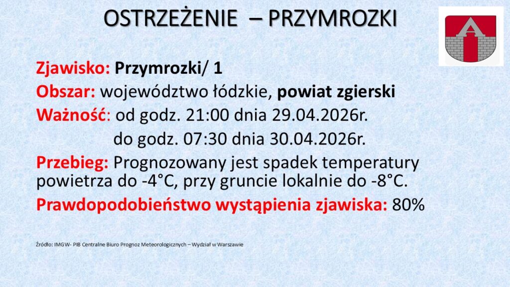 Uwaga – przymrozki! Dodano: 29.04.2026 Autor: Klaudia Kosak ZOBACZ TEŻ: 29.04.2026 Aleksandrowianie? Raczej zadowoleni! 28.04.2026 Podsumowujemy charytatywną zbiórkę elektroodpadów! 28.04.2026 Zastępczy wywóz odpadów komunalnych 28.04.2026 Uwaga – przymrozki! Aktualności AktualnościSport 28.04.2026 MORORUN – mamy już wzór medali dla biegaczy! Popatrzcie, jakie piękne medale otrzymają wszyscy, którzy dobiegną do mety podczas MORORUN – 12. Biegu Aleksandrowskiego z okazji Święta Wojska Polskiego! Mamy nadzieję, że przypadną […] AktualnościMiasto i Gmina 27.04.2026 Brak wody! AktualnościMiasto i Gmina 27.04.2026 Uwaga – przymrozki! KulturaAktualnościSport 27.04.2026 Patrycja Markowska, Julia Żugaj, Zakopower – nowe otwarcie Term Uniejów 16 maja! Z okazji swoich 18. urodzin Termy Uniejów zapraszają na otwarcie nowej strefy rekreacji. W sobotę 16 maja przez cały dzień miłośnicy wodnych przygód będą już […] ZOBACZ WIĘCEJ