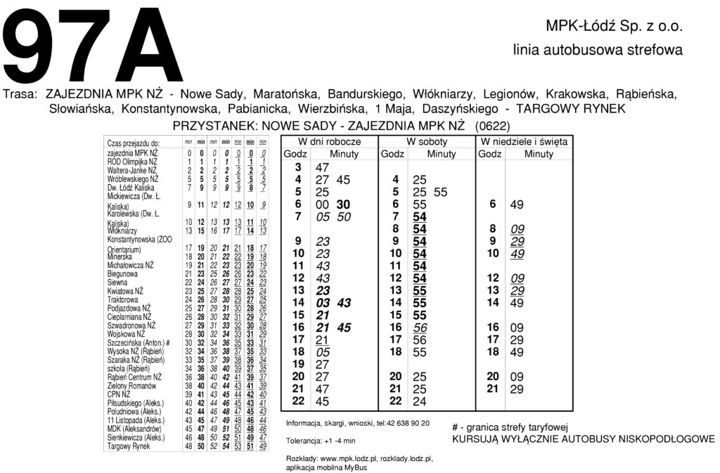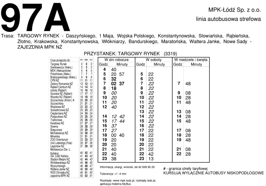 Zarząd Dróg i Transportu w Łodzi informuje, iż od 1 stycznia 2026 r. będzie obowiązywał tymczasowy rozkład jazdy linii 97A, uwzględniający prace budowlane związane z przebudową ul. Szczecińskiej, a obecny tymczasowy przebieg trasy na całej długości trasy nie ulega zmianie.