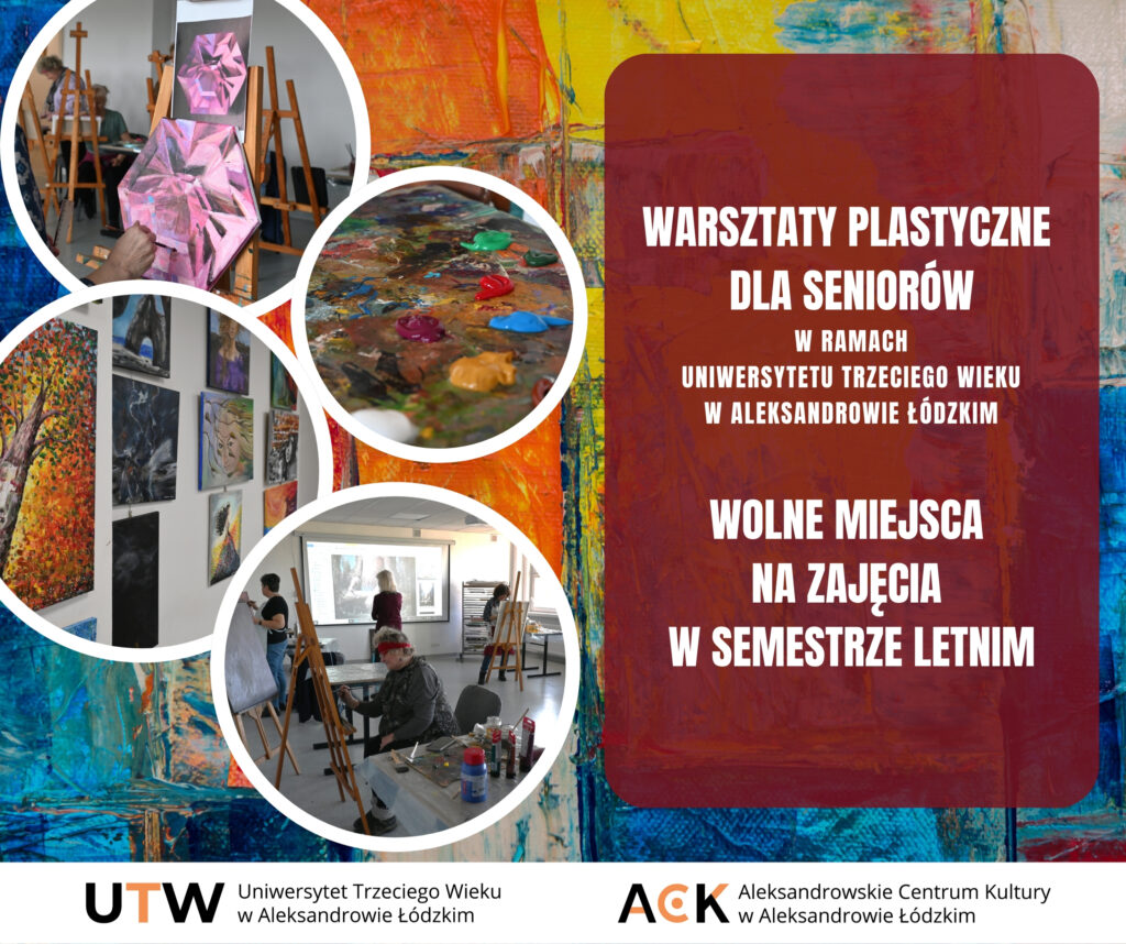 Zapraszamy serdecznie na warsztaty plastyczne dla seniorów, które działają w ramach Uniwersytetu Trzeciego Wieku w Aleksandrowie Łódzkim. Jest to idealna okazja do rozwijania swoich artystycznych pasji, spędzenia czasu w miłej atmosferze, poznania nowych ludzi oraz pokazania swoich dzieł na koniec sezonu, a dokładnie podczas wystawy Uniwersytetu Trzeciego Wieku.